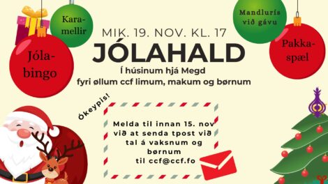 Jólahald mikudagin 19. novembur kl. 17. Melda til innan 15. nov. við at senda tal á vaksnum og børnum til ccf@ccf.fo