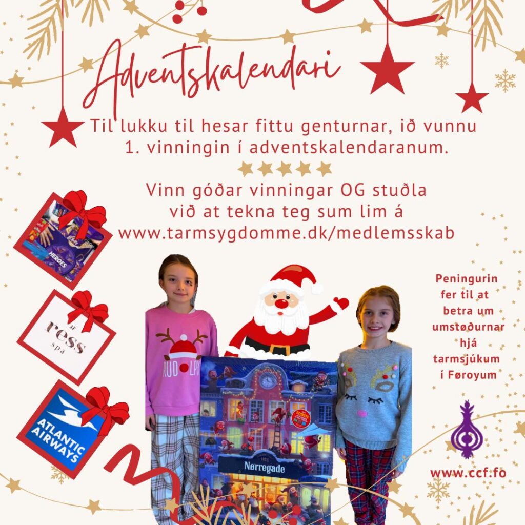 Vís vinum og kenningum okkara góða adventskalendara, so vit fáa enn fleiri limir. Peningurin fer til at betra um viðurskiftini hjá tarmsjúkum í Føroyum: https://tarmsygdomme.dk/medlemskab